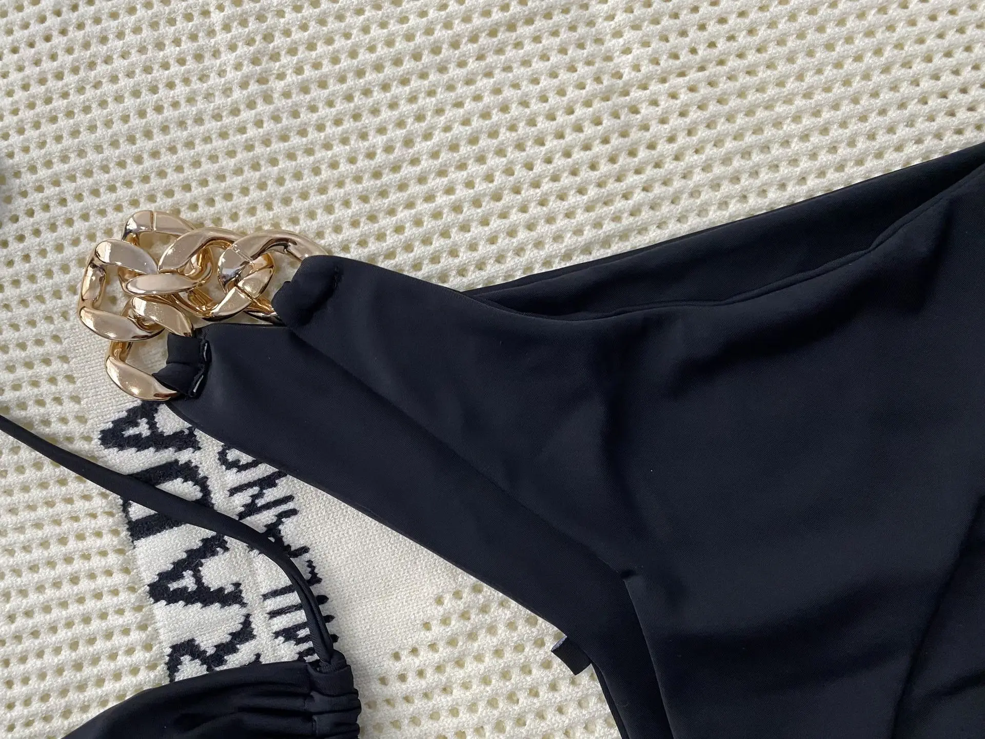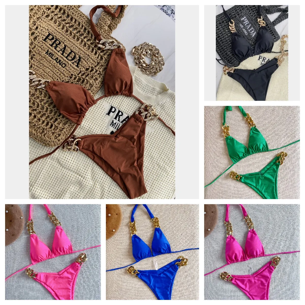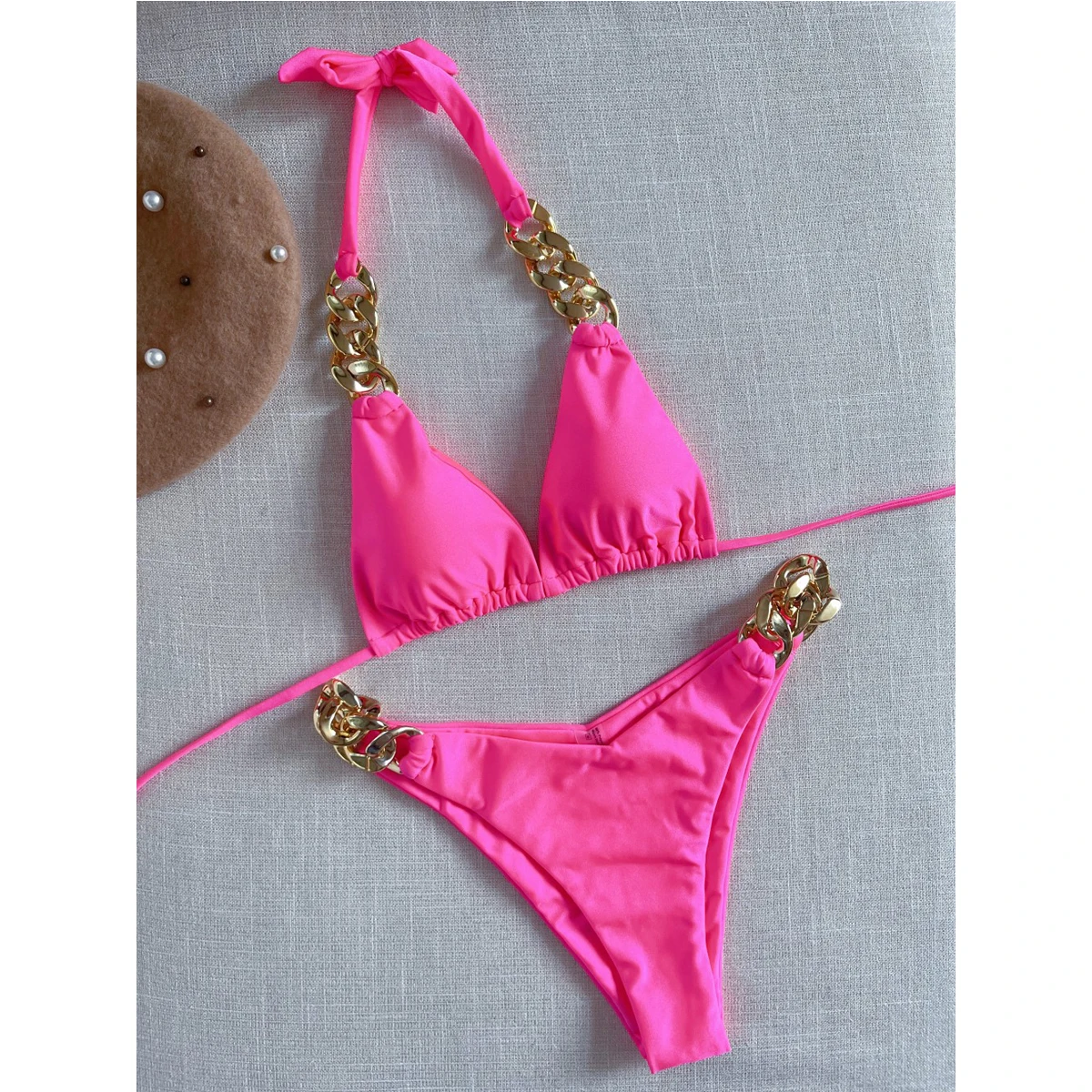 2023 Solid Color Swimsuit Women Two Piece Chain Bikini Sexy V-neck Halter Lace-up Swimwear Low Waist Thong Beach Bathing Suit