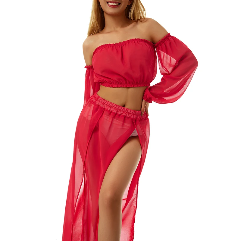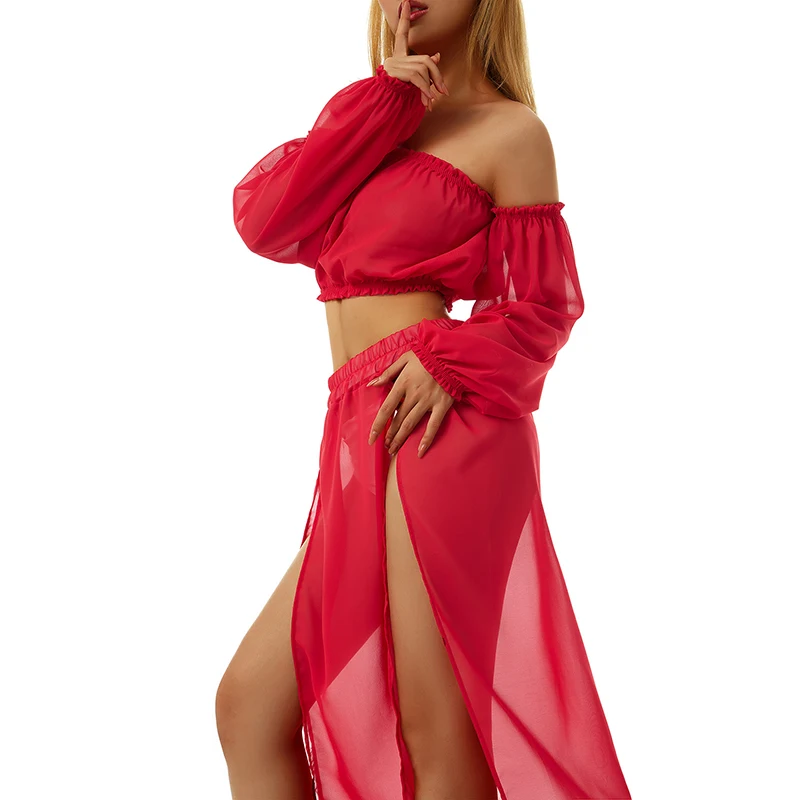 Womens Two-piece Suit Long Sleeve Off Shoulder Tops + Cover Up Skirt for Beach