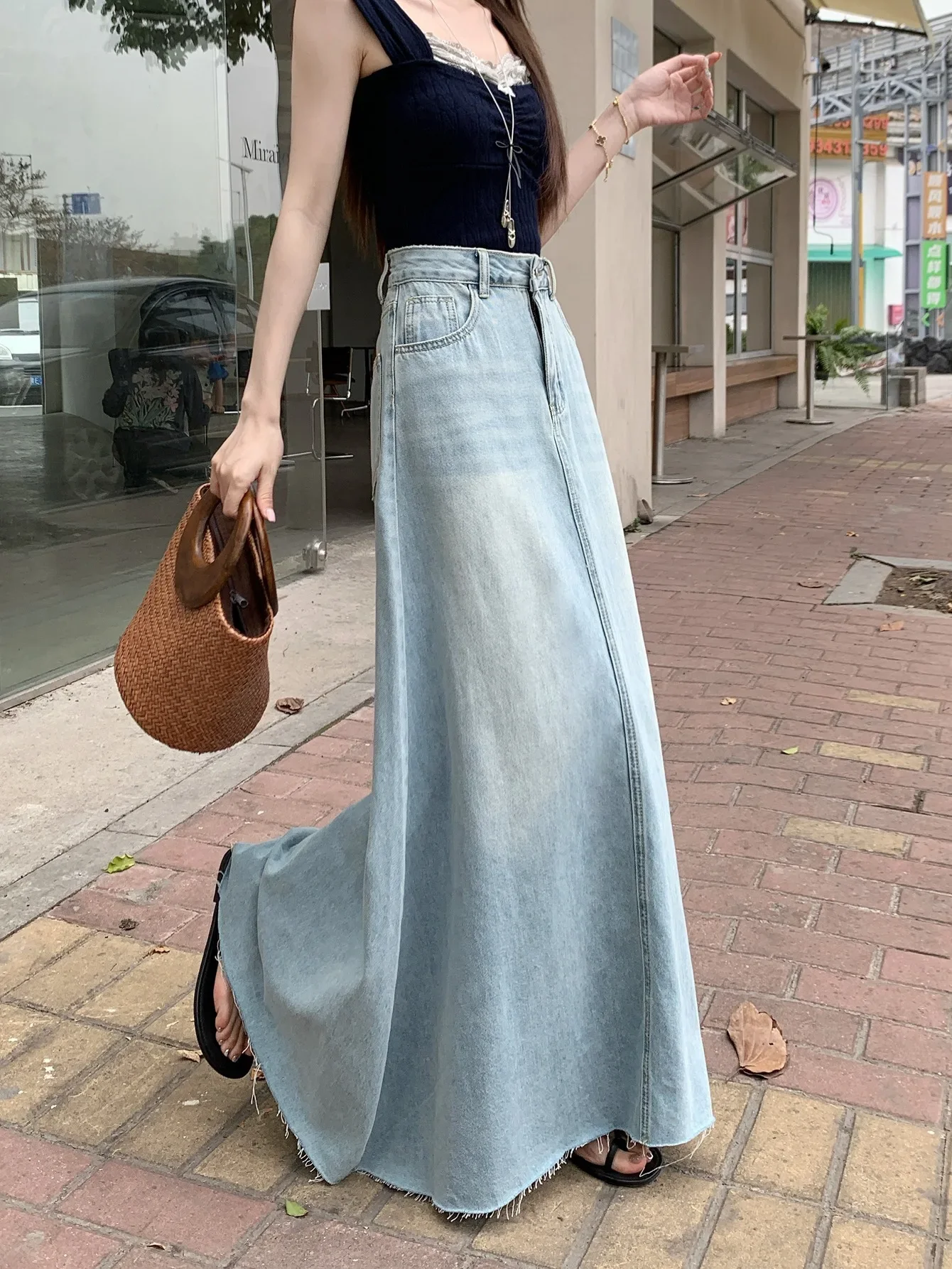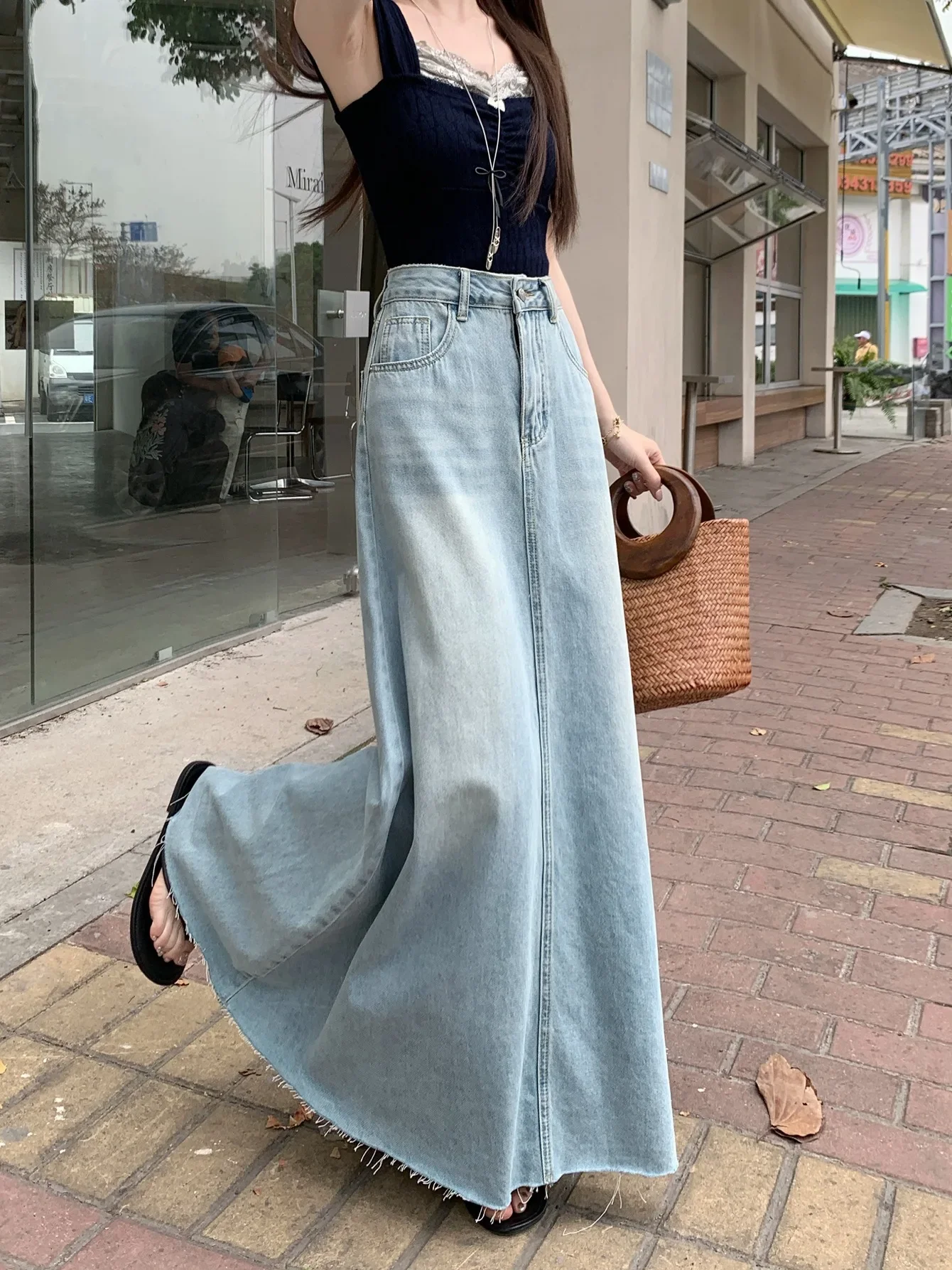 American Retro Torn Denim Mini Skirt Women's Spring New Large Size Long A- Line Loose Slimming Bodycon Skirt