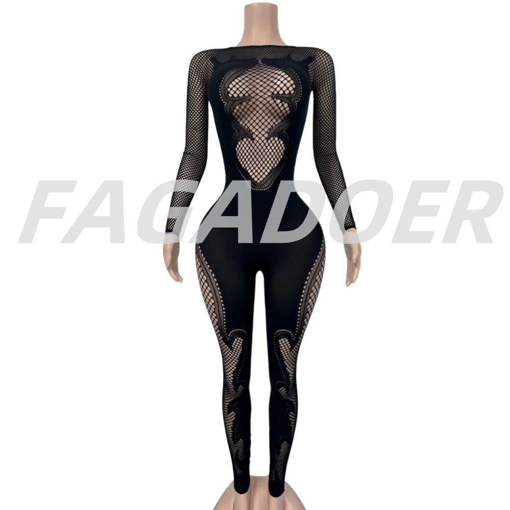 FAGADOER Y2K Sexy Quality Lace Bodycon Jumpsuit Women Long Sleeves Hollow Out See Through Romper Female Streetwear Overalls 2025